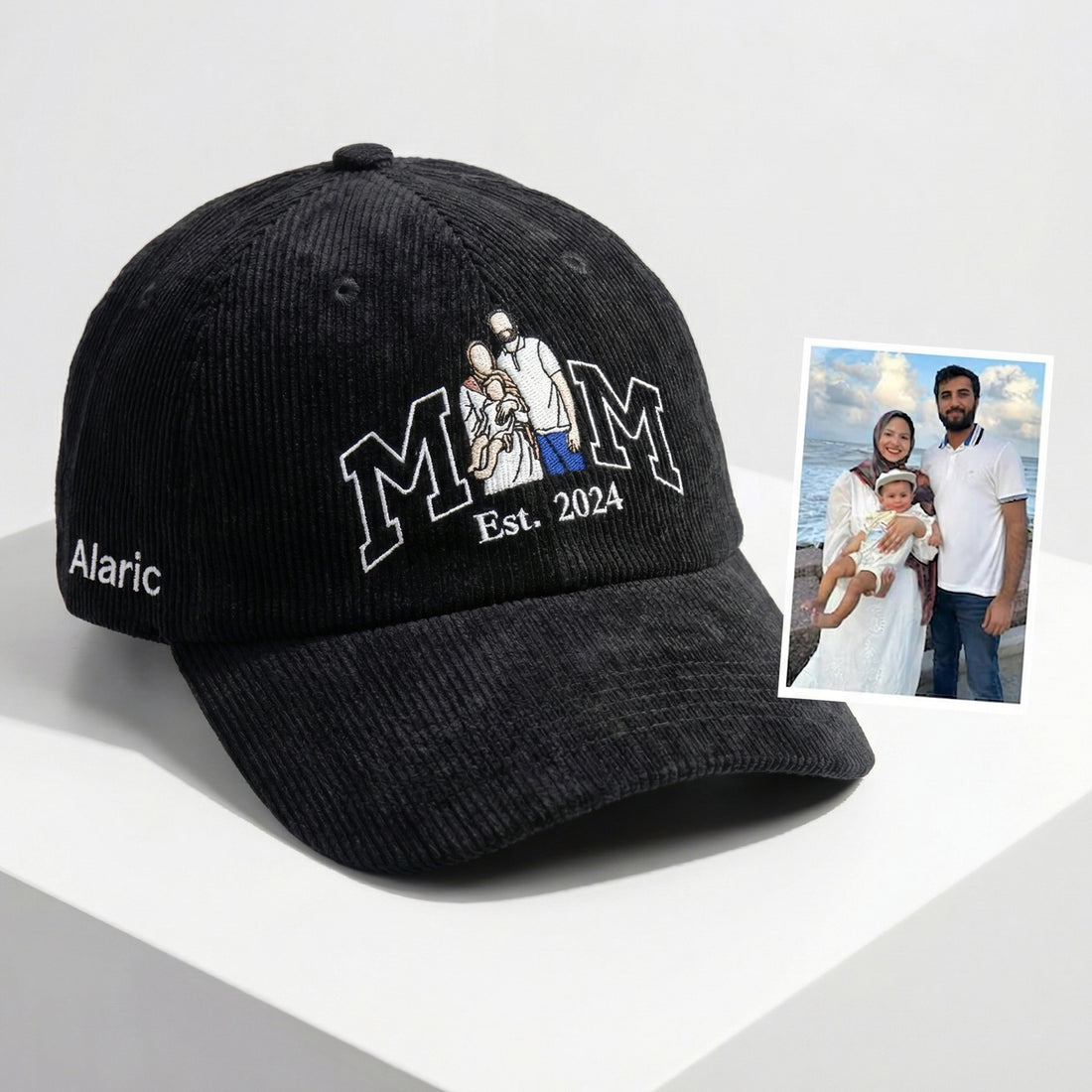 Mom Portrait Embroidered Hat – Custom Family Portrait Corduroy Cap | Personalized Photo Gift for...
