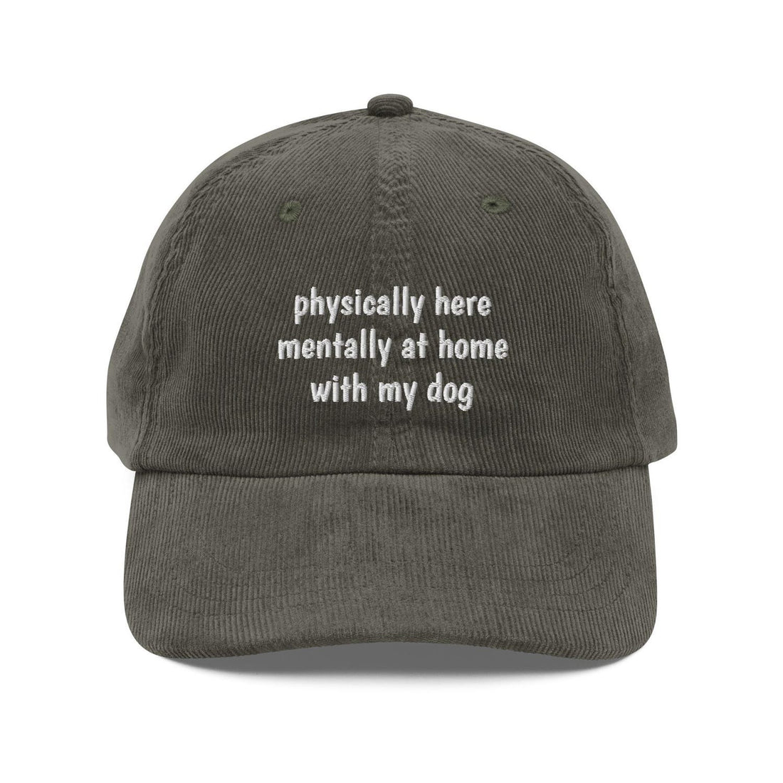 Physically Here Mentally With My Dog Hat | Funny Custom Embroidered Corduroy Cap | Bold...