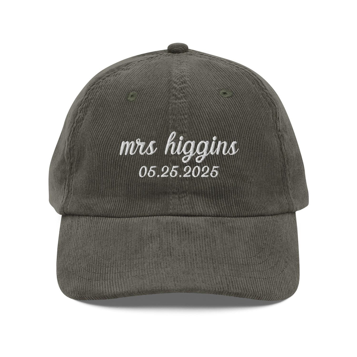 Custom Bride Mrs Higgins Aesthetic Embroidered Cap | Elegant Corduroy Dad Hat | Perfect Bachelorette Party Gift | Chic Wedding Statement Hat