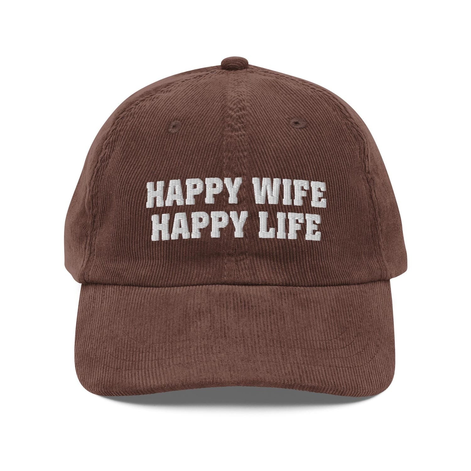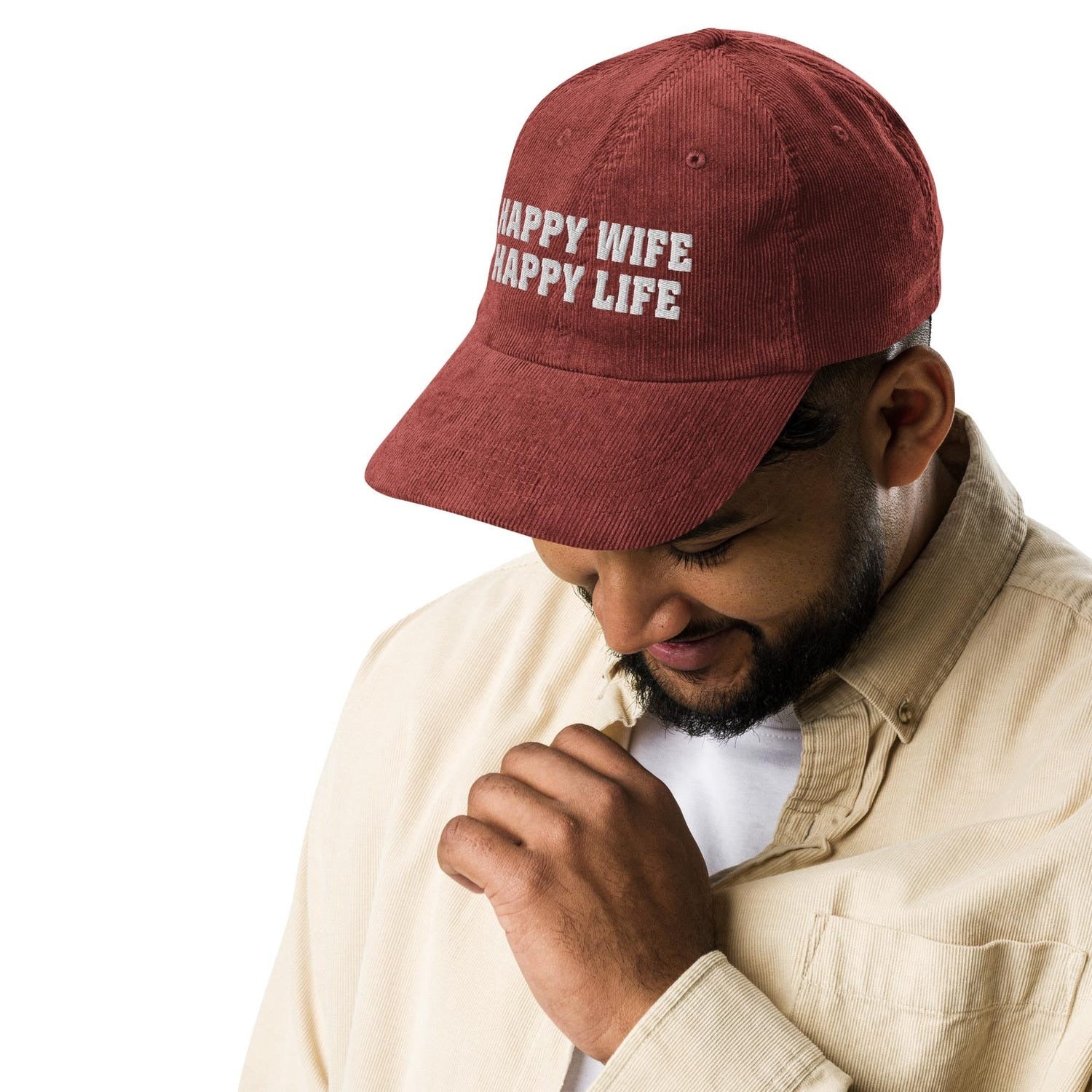 Happy Wife Happy Life Baseball Cap - Custom Embroidered Corduroy Cap, Funny Dad Hat, Gift for Married Men, Humorous Boyfriend Present