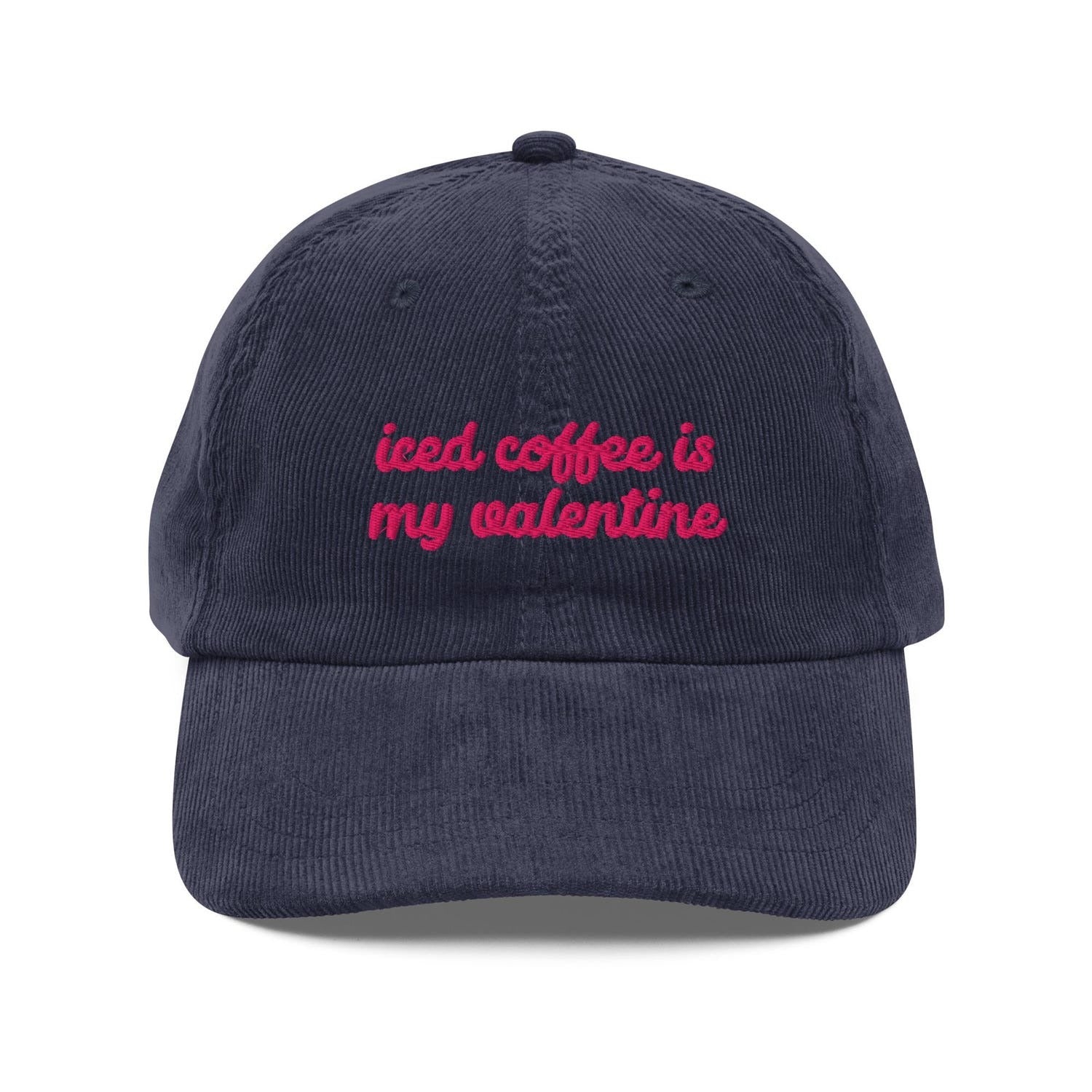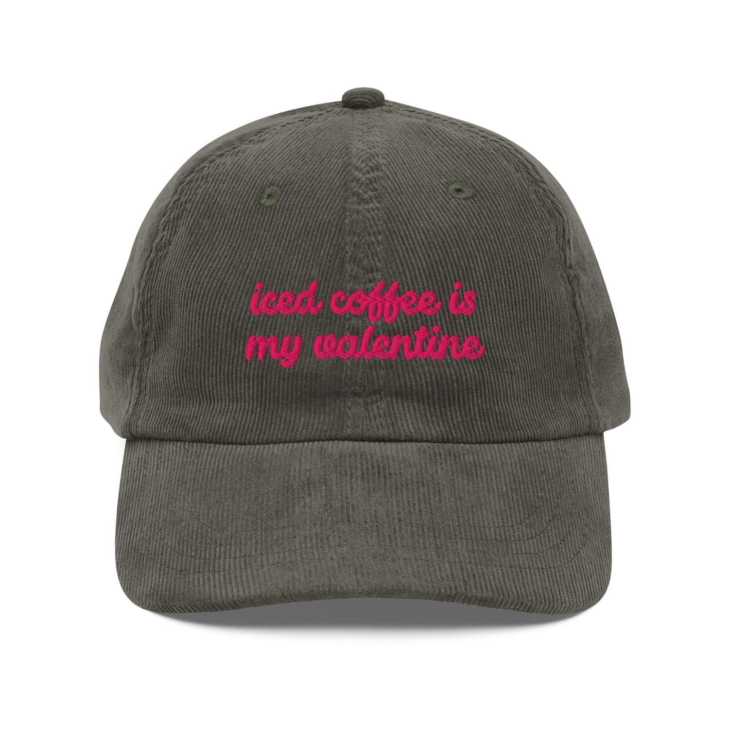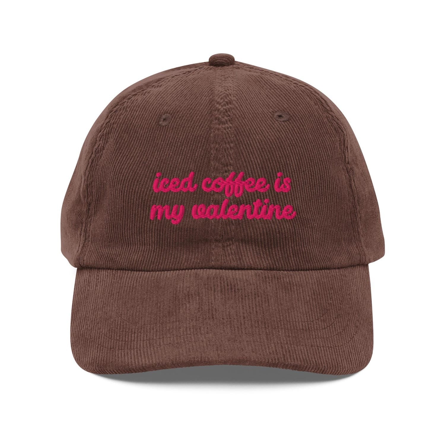 Iced Coffee is My Valentine Embroidered Cap | Funny Coffee Lover Hat | Custom Corduroy Baseball Cap | Fun & Quirky Valentine’s Gift Idea