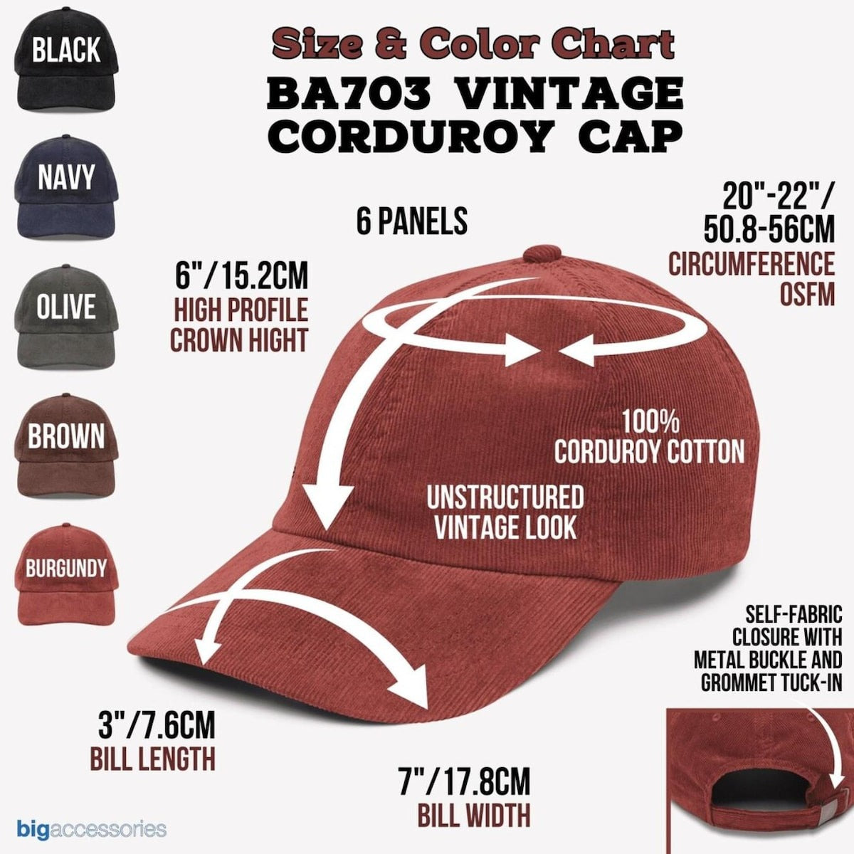 Bring back retro charm with our vintage corduroy embroidered cap, a timeless accessory designed for comfort and style. Made from 100% cotton corduroy, this unisex dad hat is soft to the touch, lightweight, and breathable—perfect for everyday wear.