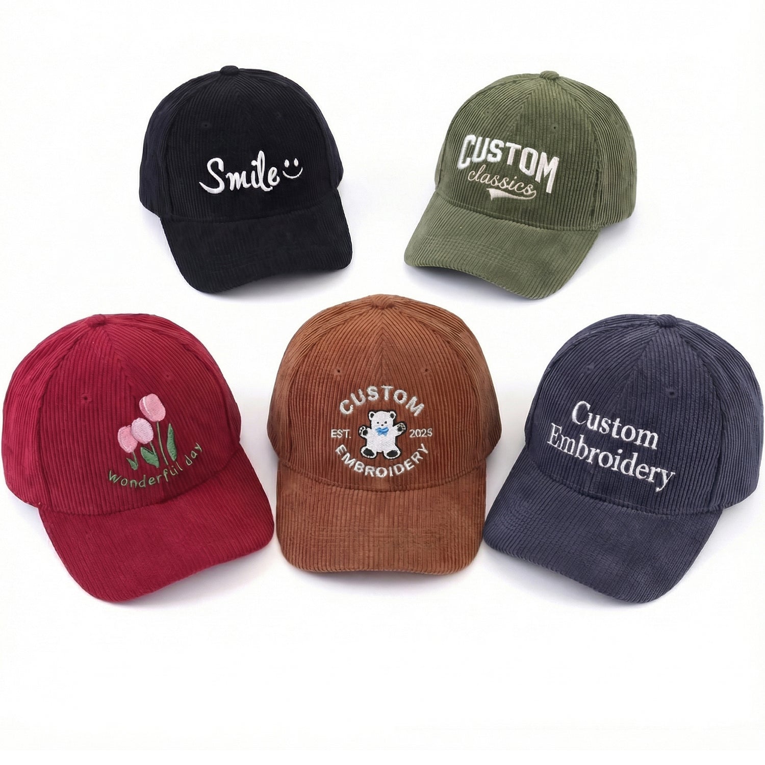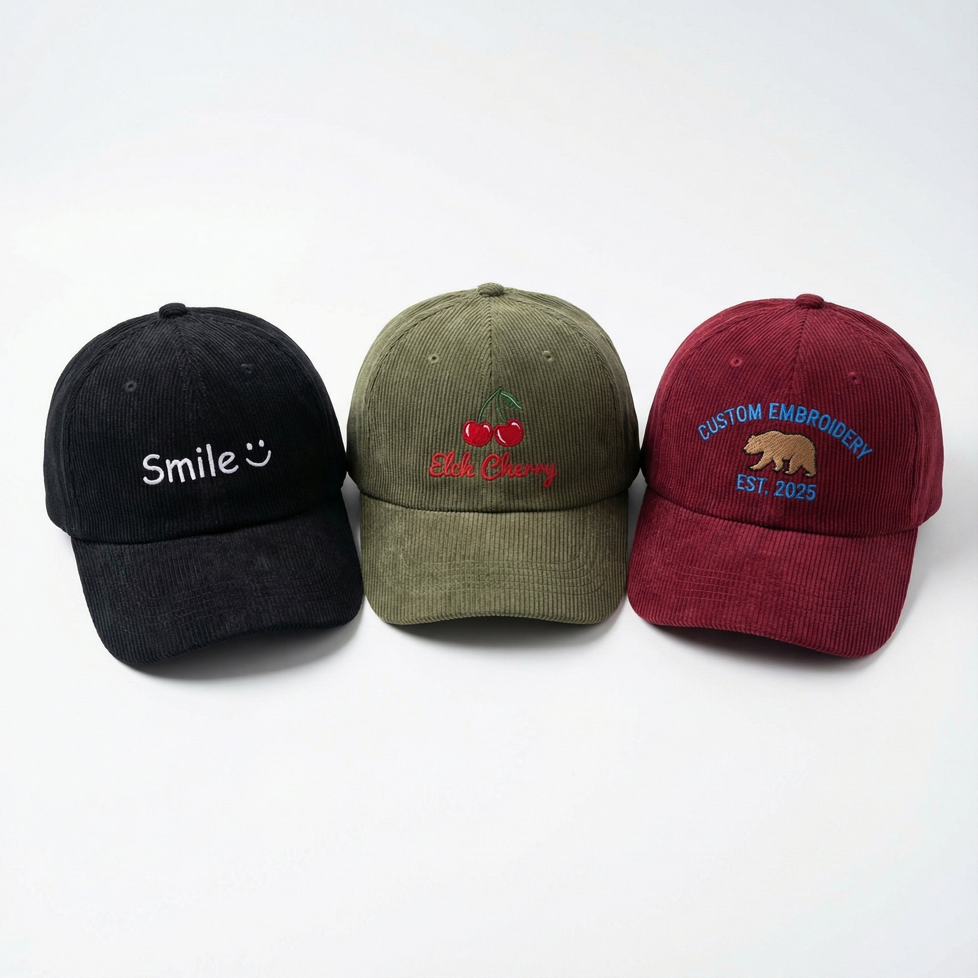 👉 Design your custom embroidered corduroy hat today and stand out with retro-modern style!